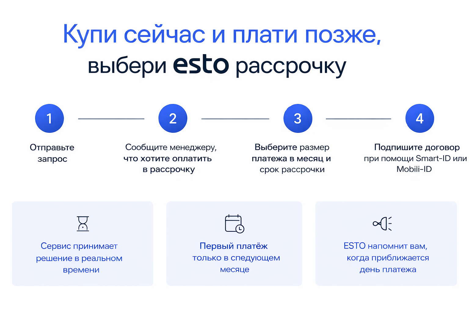 Выберите подходящий товар или услугу, сообщите представителю службы поддержки, что хотите оплатить с помощью ESTO järelmaks, и подтвердите заказ. При подтверждении покупки выберите подходящий период, размер ежемесячного платежа и подпишите договор цифровой подписью с помощью ID-карты, Smart-ID или Mobiil-ID.